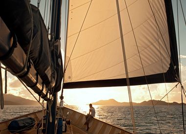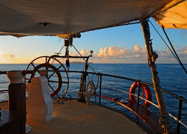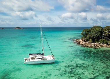 Die Sonne neigt sich dem Horizont entgegen und taucht die Granitfelsen der Seychellen in warmes Abendlicht. Ein sanfter Wind kräuselt die Wasseroberfläche, während sich das Grün der dichten Palmenwälder auf den Inseln langsam im Dämmerlicht verliert. Sie stehen an Deck eines Katamarans und spüren die sanfte Bewegung der Wellen unter Ihren Füssen. Ihr Blick fällt auf das klare Wasser, wo eine Meeresschildkröte gemächlich vorbeigleitet. Der endlose Ozean breitet sich vor Ihnen aus, während die Insel Praslin hinter Ihnen in der Ferne verblasst und den Weg für die nächste Entdeckung freigibt.